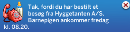 Brug telefonen, og vælg "Hyr en tjenste", vælg derefter, "Hyr en barnepige". Barnepigen vil komme med det samme.