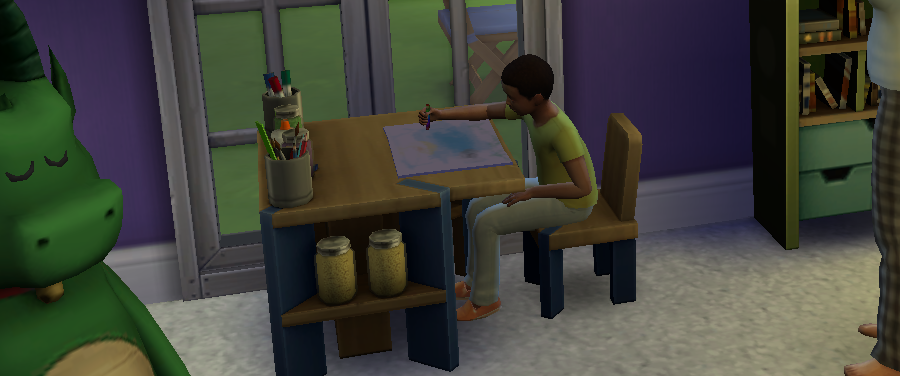 Niveau 1; Din simmer har fået Kreativitets færdigheden. Din simmer kan tegne på et aktivitetsbord, dukkehuset og legetøj fra legetøjskassen