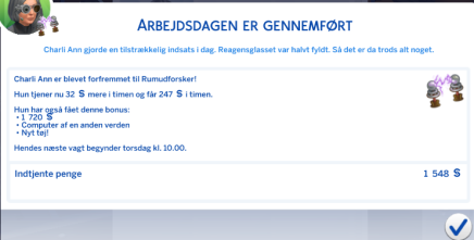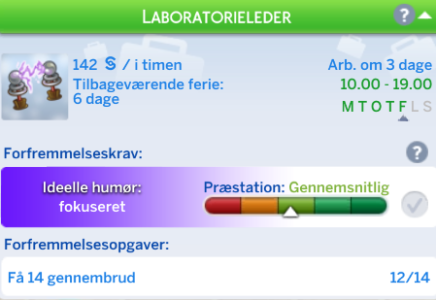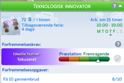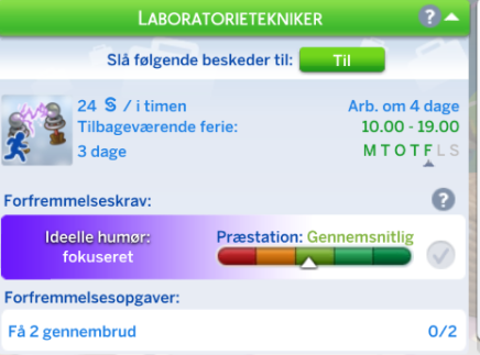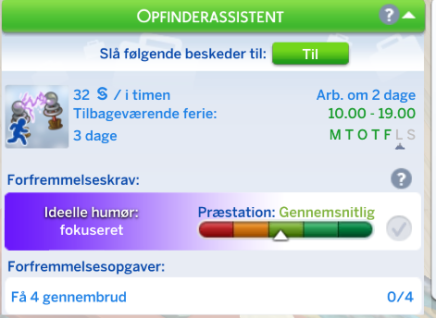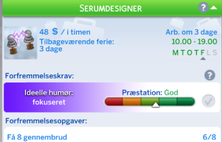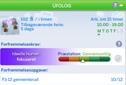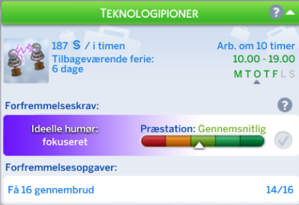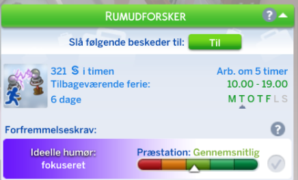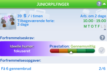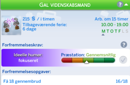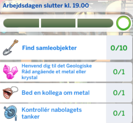 Din simmer har 7 simmer timer til at fuldføre sine mål. Jo flere mål din simmer opnår, jo flere simoleoner vil din simmer tjene til sidst, når hendes/ hans arbejdsdag slutter.