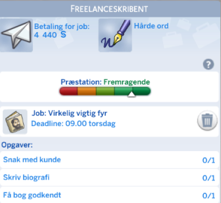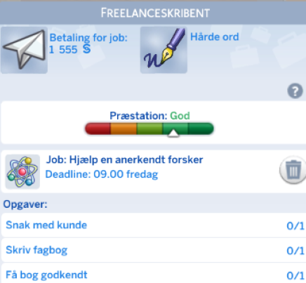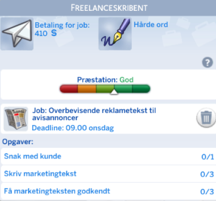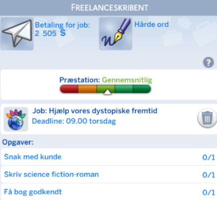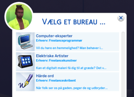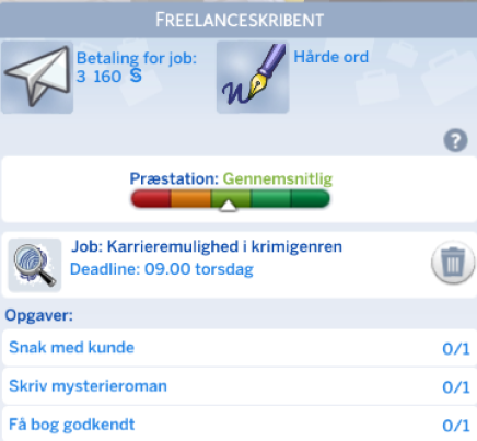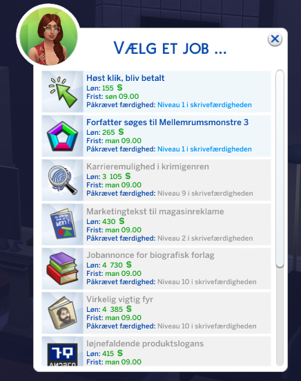 Til at starte med er der ikke mange muligheder at vælge imellem, men jo højere niveau din simmer stiger i Skrive færdigheden, vil din simmer få flere jobs at vælge imellem.