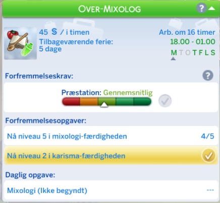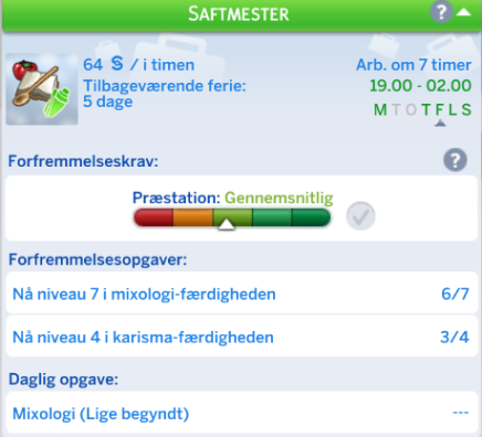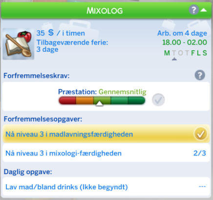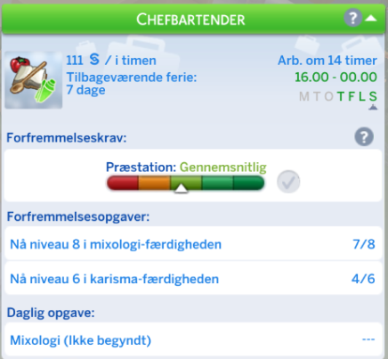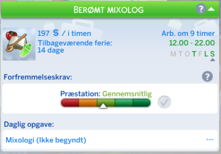 Din simmer vil gerne lære at blande drinks og det sociale samvære med andre simmere. Din simmer vil være bartender!
