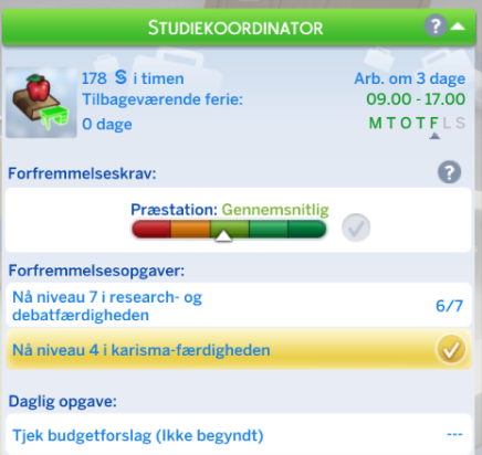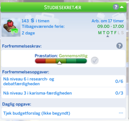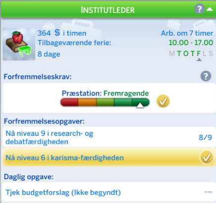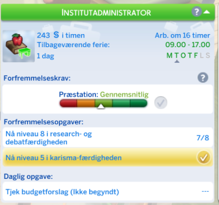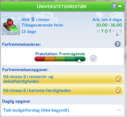 Selvom at din simmer har nået toppen af sin karriere, betyder det ikke at hun/han kan slappe af endnu. Din simmer skal stadigvæk møde til tiden og lave en god præstation på jobbet, ellers kan din simmer blive degraderet og miste alt sit hårde arbejde.
