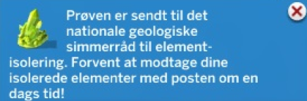 Din simmer kan " Send det til Geologiske Råd ", uden at det koster din simmer nogle simoleoner. Når din simmer vælger at gøre dette, vil de få en lille kasse tilbage som er blevet lavet om til et " Element ".
