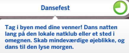 Med Nye Venner udvidelsespakke, kan din simmer planlægge en social begivenhed, nemlig Dansefest. Der er ikke nogle mål at gennemføre i denne sociale begivenhed. men din simmer kan lære en ny færdighed; Danse færdighed.