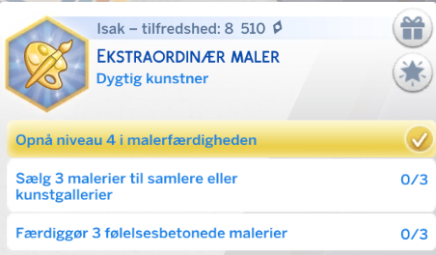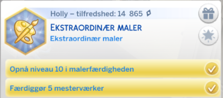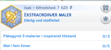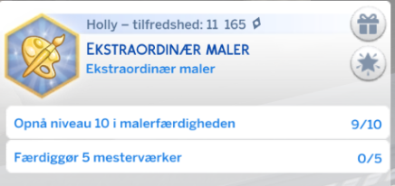 Din simmer drømmer om at blive den bedste maler/ kunstmaler i verden. Din simmer kan tjene mange simoleoner, hvor de både kan sælge til en Samler eller til Kunstmuseumet. Dette er en god hobby, livsdrøm hvis man ikke ønsker sig et job.