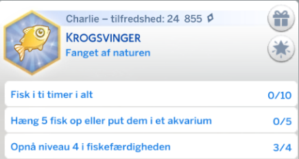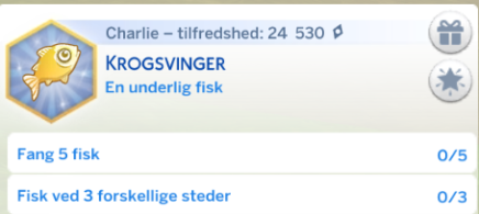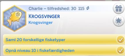 Din simmer har fuldført en Stræben! Din simmer er blevet en rigtig fiske elsker, velkommen til livet som fisker. Din simmer modtager en ny Egenskab; Fiskerens ro.