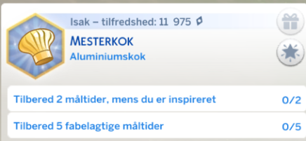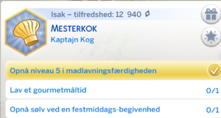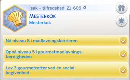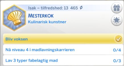 - Din simmer har fuldført denne Stræben! Din simmer har nået toppen af karrieren. Din simmer modtager en ekstra Egenskab; Frisk kok.