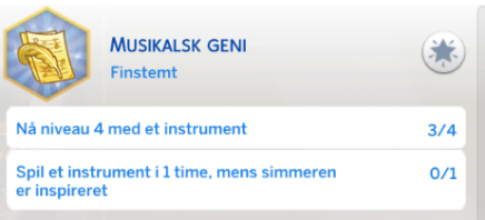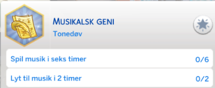 - Din simmer har fuldført denne Stræben! Din simmer kan nu kalde sig for en musikalsk mester. Din simmer modtager egenskaben; Musikfænger.
