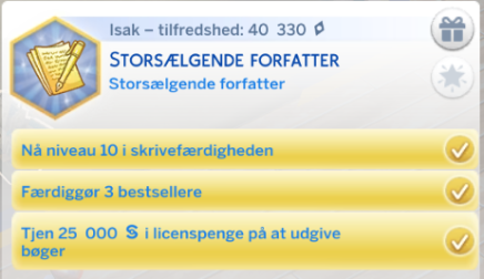 - Din simmer har fuldført denne Stræben. Din simmer er nu blevet en Storsælgende forfatter. Din simmer modtager en ekstra Egenskab; Poetisk