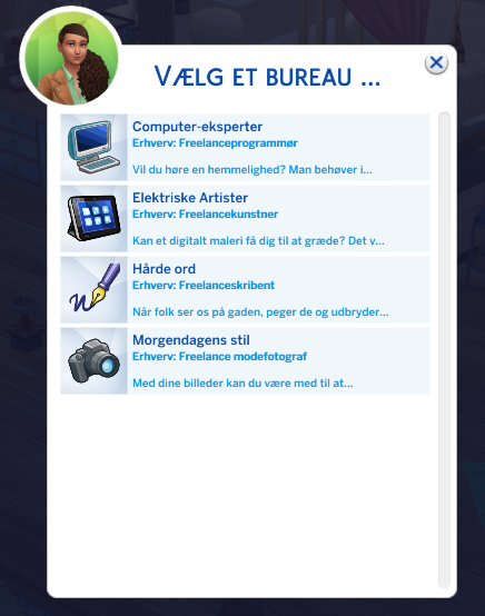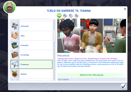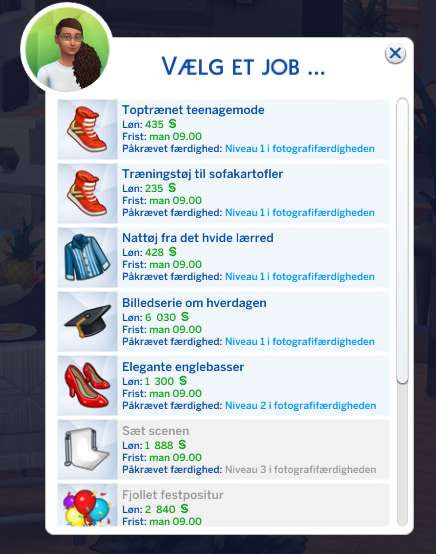 Listen af job's, giver din simmer mulighed for at vælge imellem forskellige gig's! Din simmer kan dog kun vælge mellem job, hvor din simmer har den rigtig færdigheds niveau.
