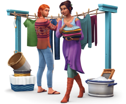 Med den nye ekstra pakke; Vaskedag, kan dine simmere nu vaske deres tøj. Hvis din simmer ejer en vaskemaskine, tøremaskine, vaskebaljen med rive, tøresnor, vaskekurv, vil dine simmere tøj blive beskidt efter noget tid. Når din simmer skrifter tøj, vil de efterlade en bunke beskidt tøj på gulvet. Hvis din simmer ejer en vaskekurv, vil de automatisk komme tøjet i denne.