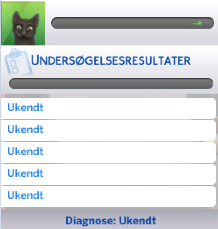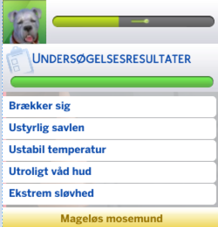 Prøv dig lidt frem af de muligheder der er. De 3 bedste er; "Tag temperatur", "Undersøg hud/pels", og "Undersøg munden". Når din simmer har fundet alle de ukendte symptomer, vil diagnosen blive kendt og du kan nu behandle kæledyret med medicin.